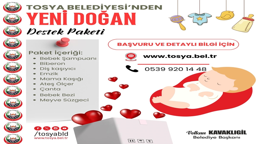 Tosya Belediyesi olarak, ailelerimizin sevincine ortak olmak ve minik hemşehrilerimize güzel bir başlangıç sunmak için Yeni Doğan Destek Paketimizi sizlere hediye ediyoruz.