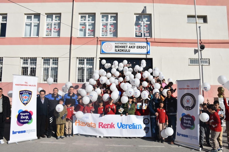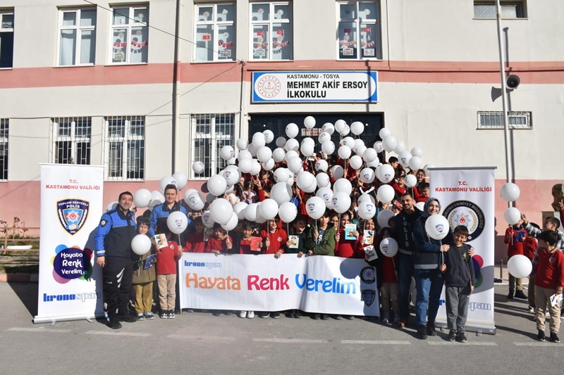 Kastamonu İl Emniyet Müdürlüğü Toplum Destekli Polislik Şube Müdürlüğü ve Tosya İlçe Emniyet Müdürlüğü personelinin ortak çalışmaları ile “ Hayata Renk Verelim” 2025-2026 yerel sosyal sorumluluk projesi kapsamında, Tosya ilçesi Mehmet Akif Ersoy İlkokulu öğrencileri ziyaret edilmiş, öğrencilere temel güvenlik kuralları, güvenli internet kullanımı ve sosyal medya bağımlılığı konuları anlatılarak destekleyici videolar izlettirilmiş, eğitim sonrası öğrencilere okuma setleri ve kırtasiye malzemeleri hediye edilmiştir.