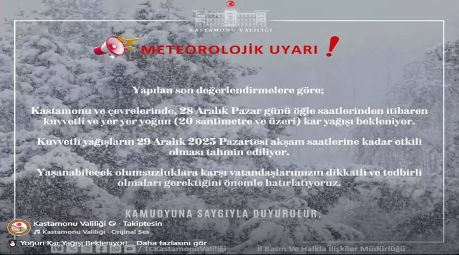 📍 Kastamonu ve çevrelerinde, 28 Aralık 2025 Pazar günü öğle saatlerinden itibaren kuvvetli ve yer yer yoğun (20 cm üzeri) kar yağışı bekleniyor.
